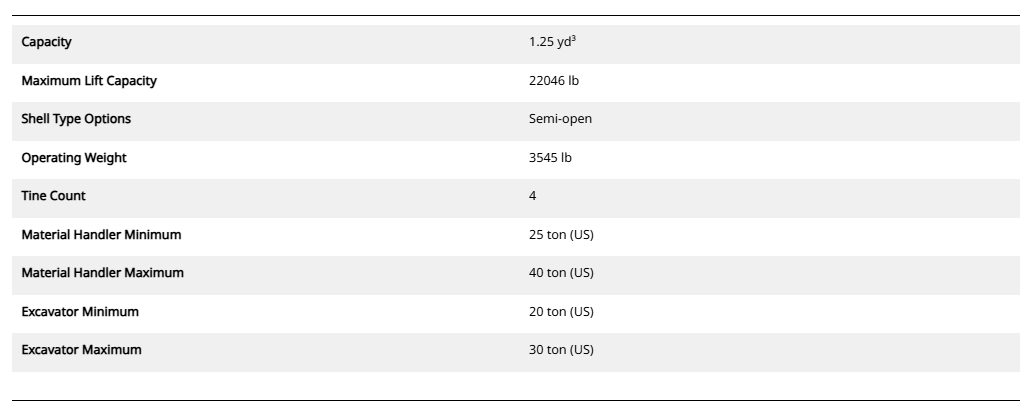 Product Specifications for GSH425 4-Tine, 950-Liter Orange Peel Grapple